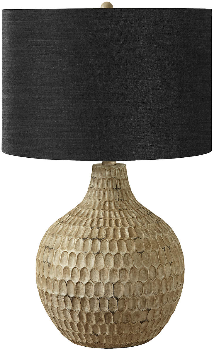A stylish and trendy 25"h table lamp in a textured gourd shaped, brown resin base with a classic black linen drum shade for a contemporary upgrade in a living room, bedroom, or home office