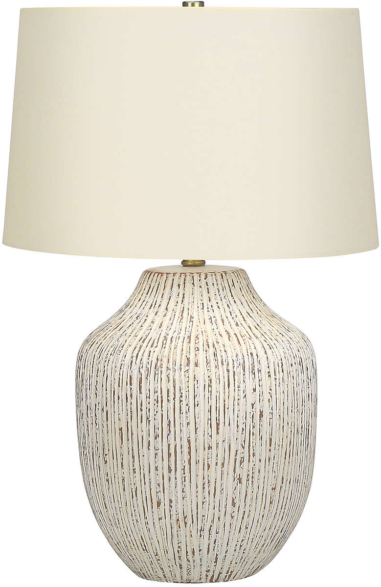 Transitional style with a vase-like shape, this 26"H textured cream ceramic table lamp topped with an ivory linen drum shade and finished with a gold finial on top, will bring fashionable, casual style to any living room, bedroom, or home office space