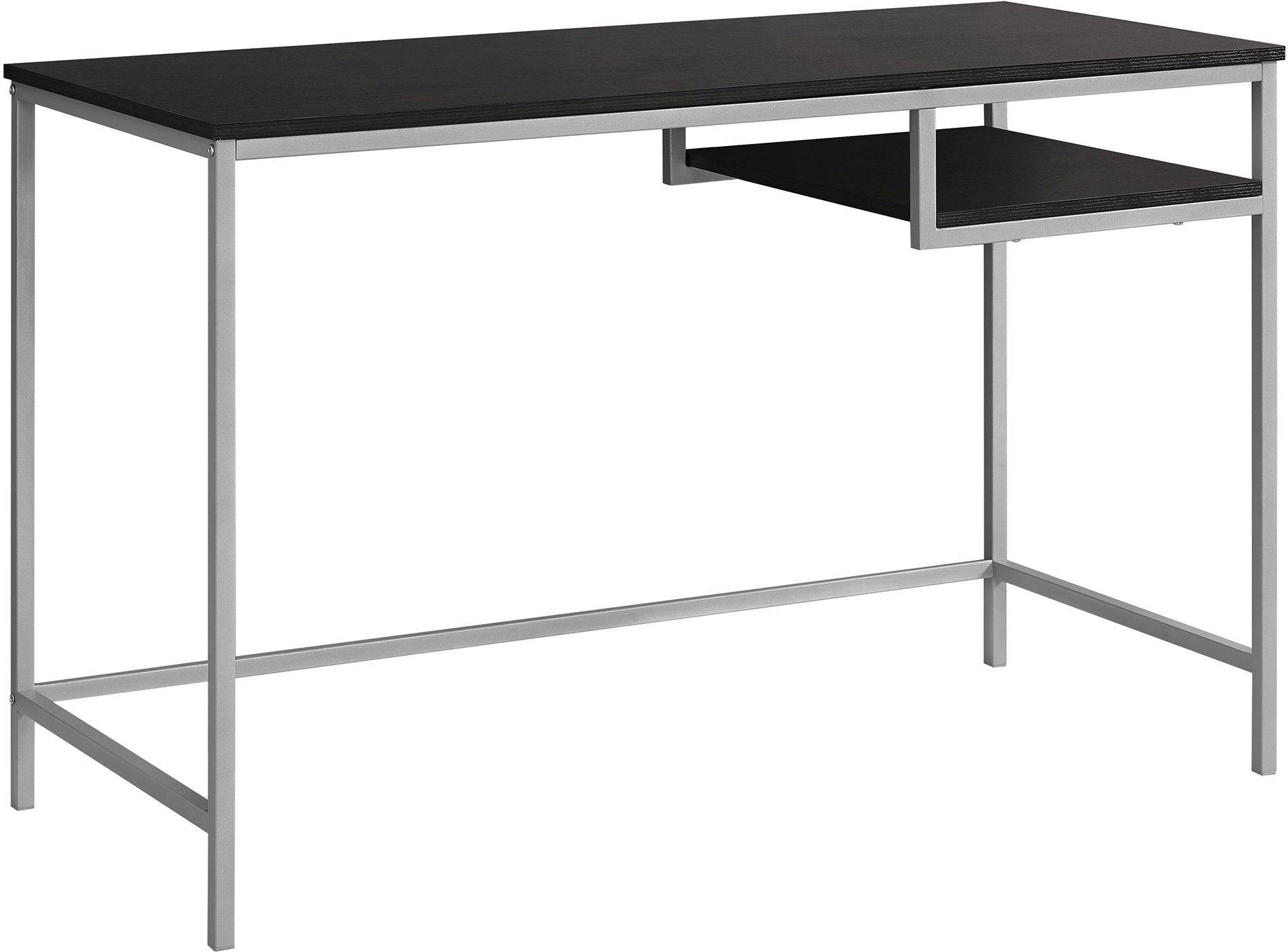 Simplicity with functionality is what you will find in this retro inspired, industrial style computer desk. The sleek cappuccino laminated top made from quality MDF material has ample space for your laptop, a lamp, some office supplies, with a suspended open shelf underneath to store books or paperwork. The sturdy silver metal base adds to the airy modern look making it ideal even for compact workspace.