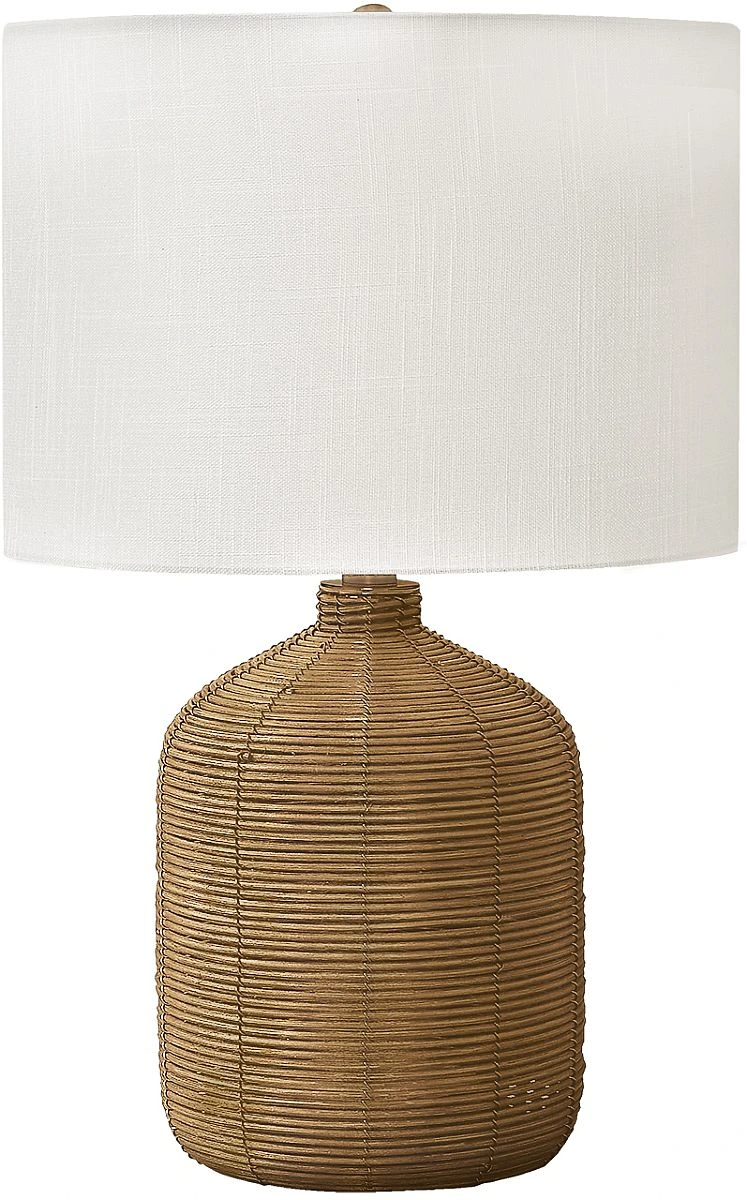 Add a casual chic ambiance to your living room, home office, or bedroom with this stylish and fashionable 23" h table lamp. This ginger jar base in a brown rattan is complimented by a beige fabric drum shade and finished with a gold finial on top.Read More