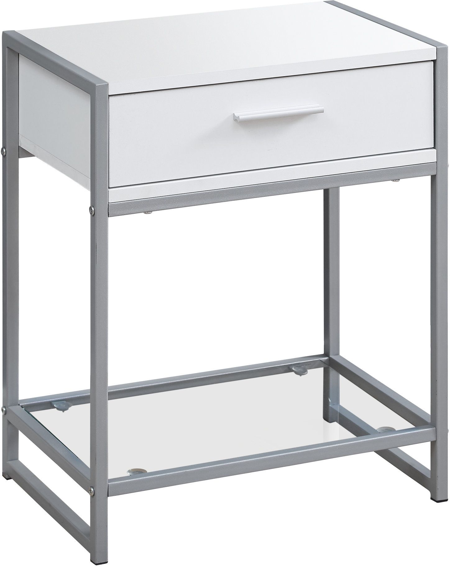 Bring style with function to any space in your home with this modern accent table in a fresh white finish and silver metal accents. The compact size and sleek style make it easy to use as an end table next to your favourite chair or as a nightstand in a minimalist bedroom space. The handy storage drawer on metal glides is finished off with a silver metal handle and the tempered clear glass bottom shelf is perfect to stack books or a nice plant for a decorative touch. This versatile side accent table made from quality medium density fiberboard material will serve many functions in your home for years to come! Assembly is required.