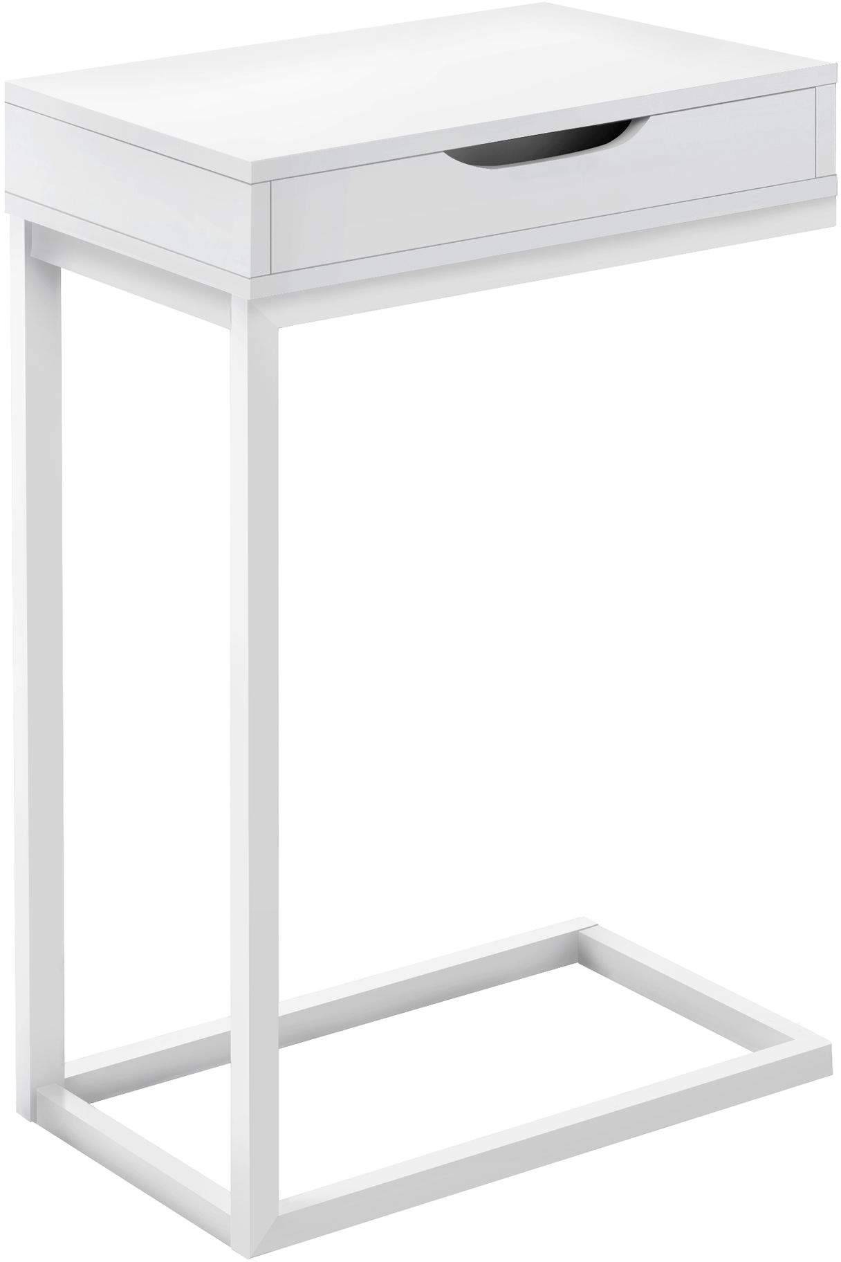 Tired of holding a beverage in your hand and a bowl of popcorn in your lap while binge watching? This C table keeps them within easy reach so you can sit back and enjoy the show. The C-shaped base slides under your sofa or chair, placing the table surface close to you. For added convenience, the top includes a storage drawer that is accessible from both sides. Use it to hide away mobile devices to avoid interruptions while you're watching TV, then store remotes in it when you're done. Stylish and versatile, this portable accent table features a top in a smooth, white finish and a metal frame in white that adds a modern look wherever you need a small side table with storage.