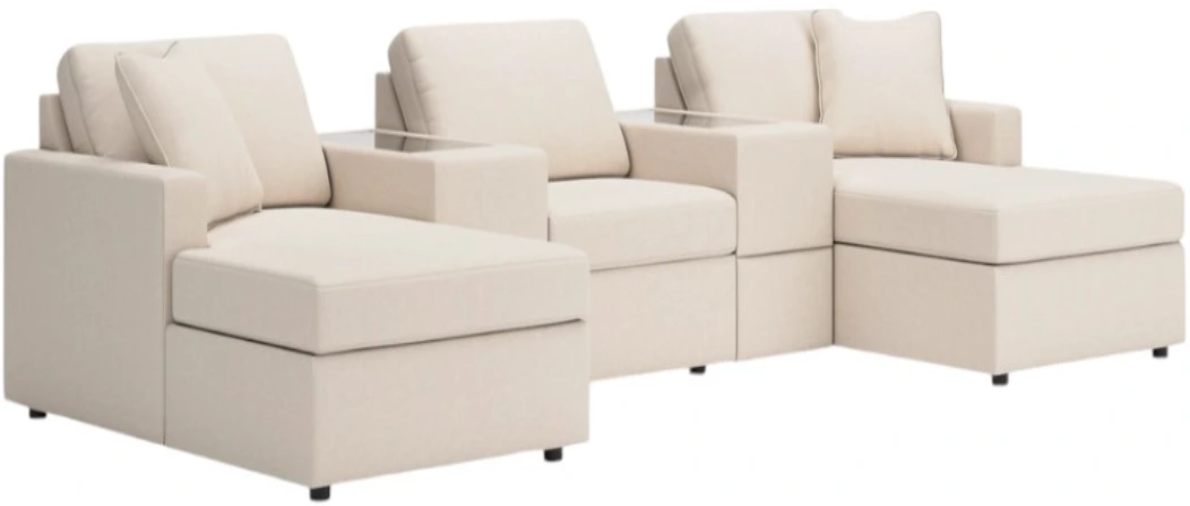 Includes 5 modular pieces: left-arm facing corner chaise, armless chair, 2 consoles with storage and right-arm facing corner chaise