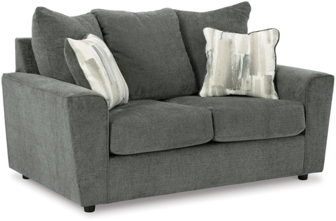 Contemporary flared arms give it a distinctive flair. This loveseat also arrives with two cool brushstroke accent pillows to elevate the taste and comfort level.